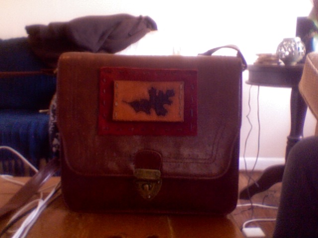 I haven’t had a ton of days off in the last month – ever since we lost our third manager. Today is my only day off this week, and so far I’ve been very productive! I’m always amazed at how much I can accomplish if I don’t stay in bed and watch Bones all morning! So this morning, I went to Ross and bought a couple of really cute shirts, then I went to Target a bought a new bag. The bag, though it’s really cute, is definitely made of fake leather, so to make me feel better for buying it even though I could make it, I sewed a leather leaf to the front flap. Here’s a picture…