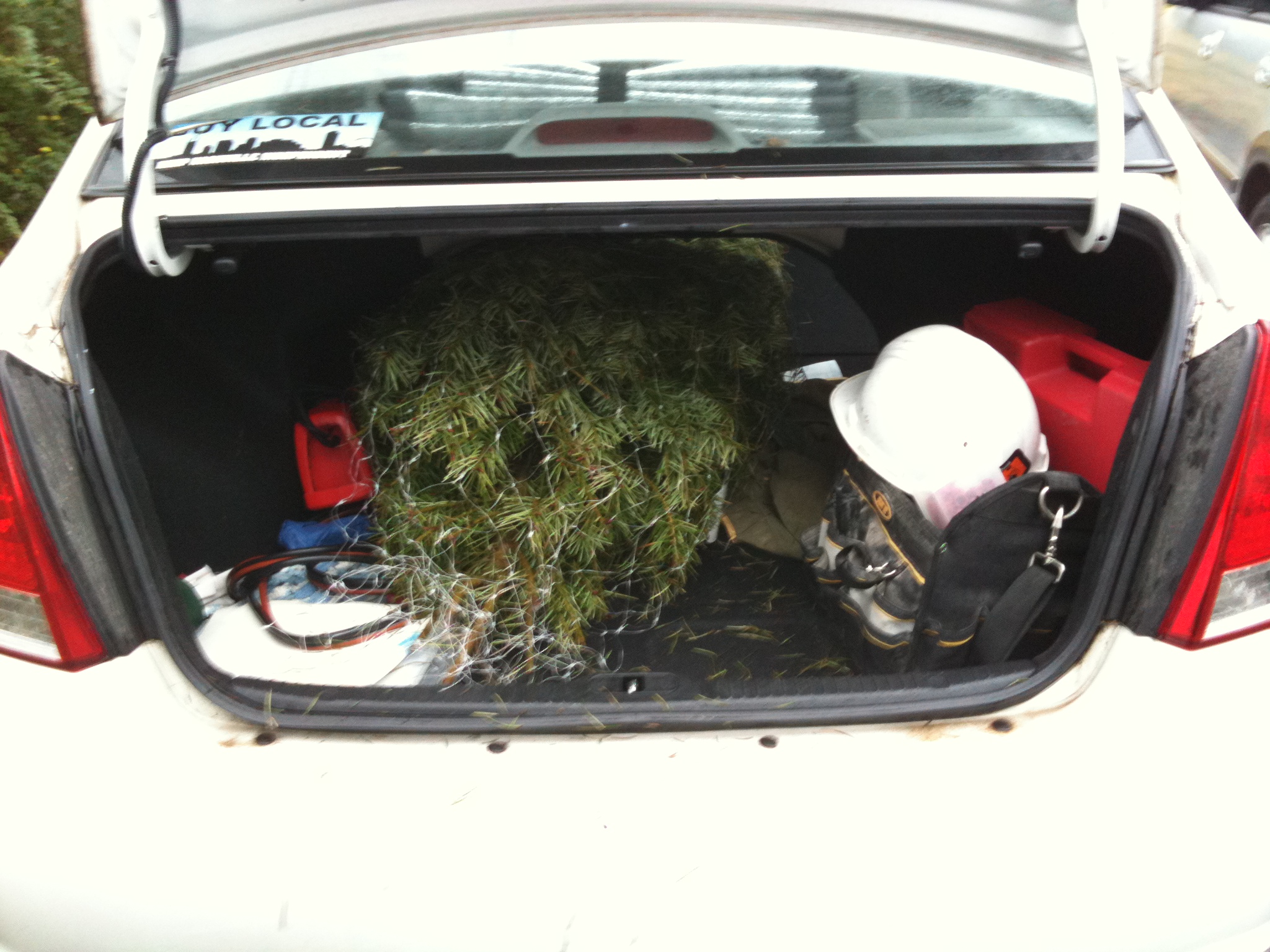 So I went to Lowe’s and found a big Douglas Fir and bought it and everything all by myself (still kind of a big deal). The quiet, nice older man who trimmed it and wrapped it for me helped me get it in my little Kia trunk. I took a picture for effect. It’s a small car.