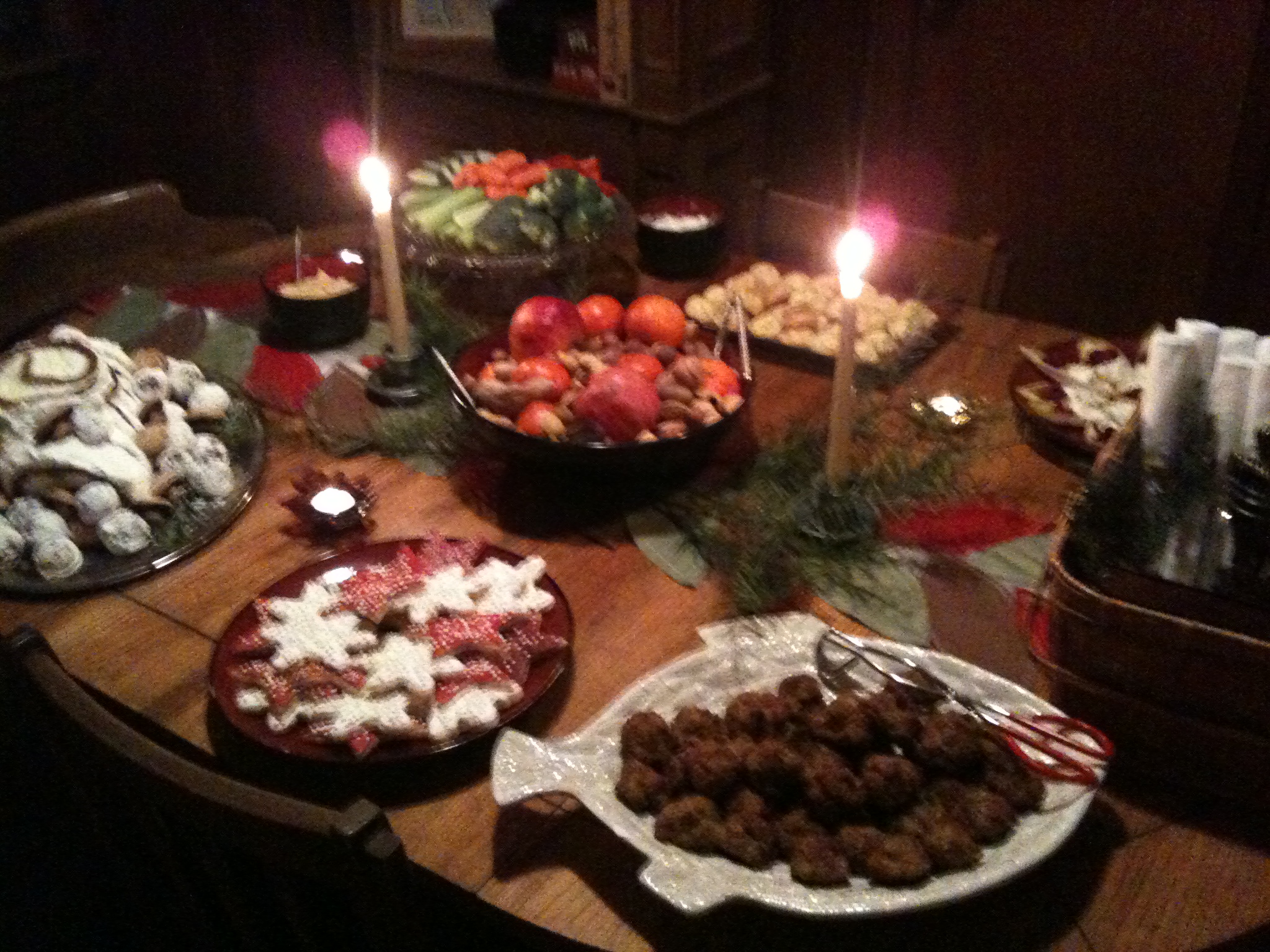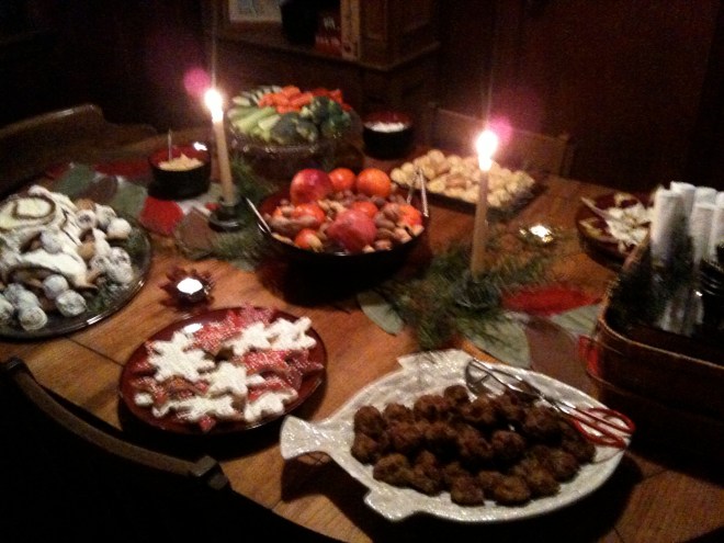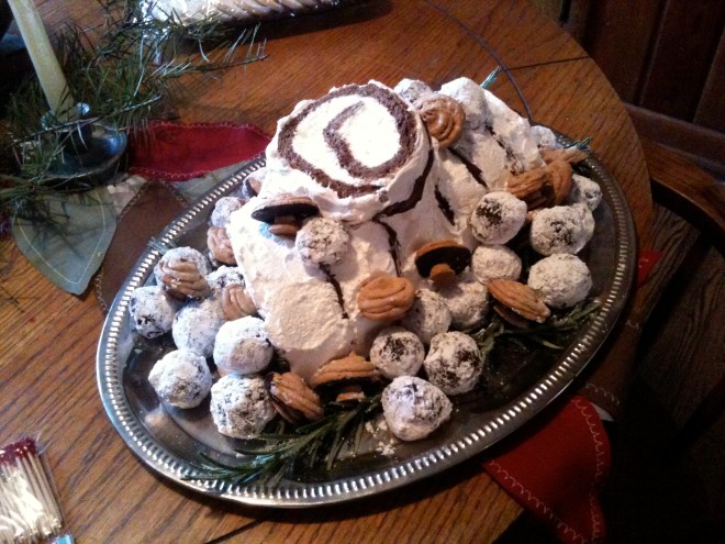 Left to right – the yule log, sugar cookies (that I made, of course), and sausage balls (which Matt made).