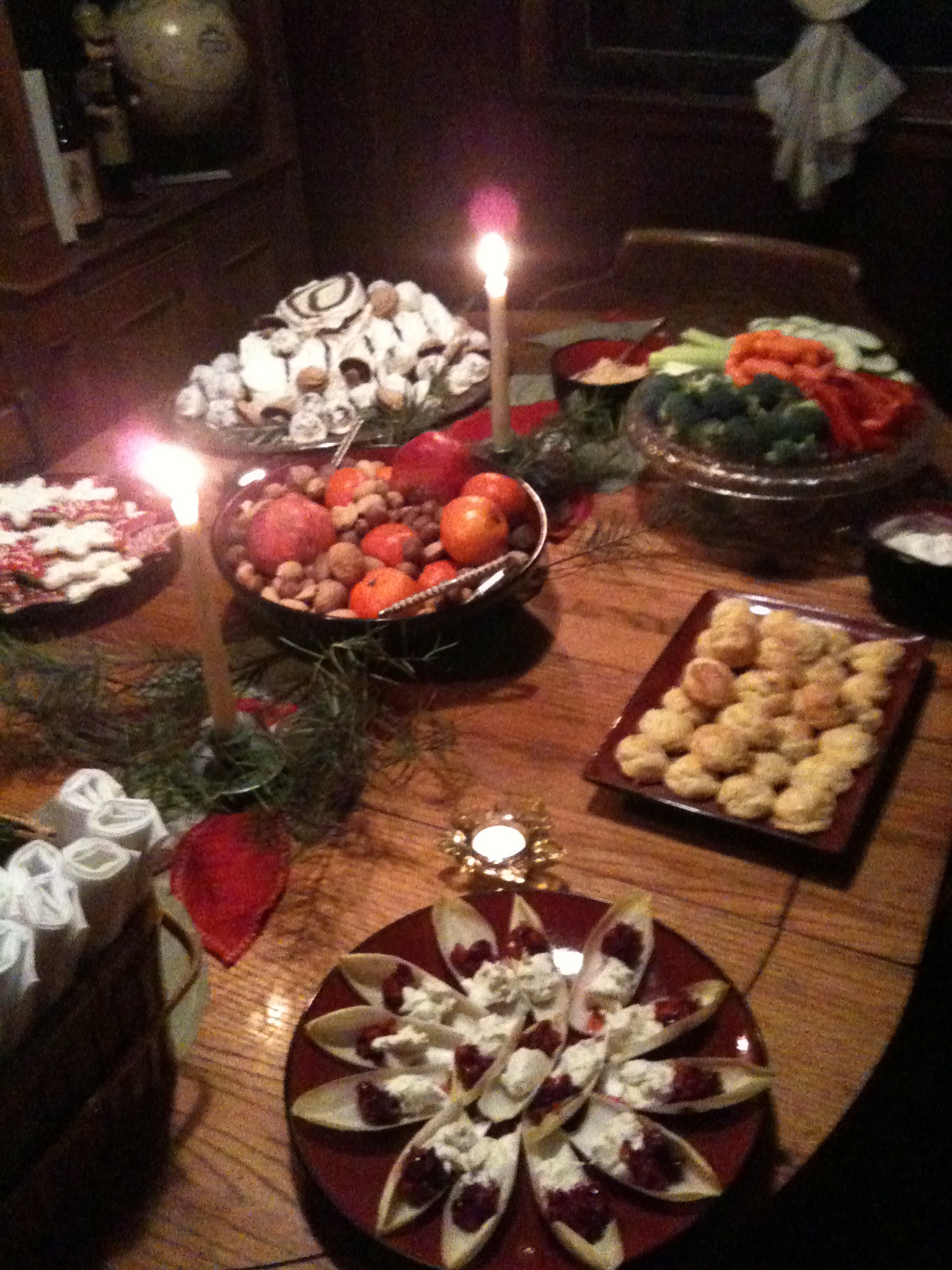 Starting at the top of this picture, there’s a veggie platter, then gougeres (with goat cheese and rosemary), and then endive spears with goat cheese and cranberry relish.