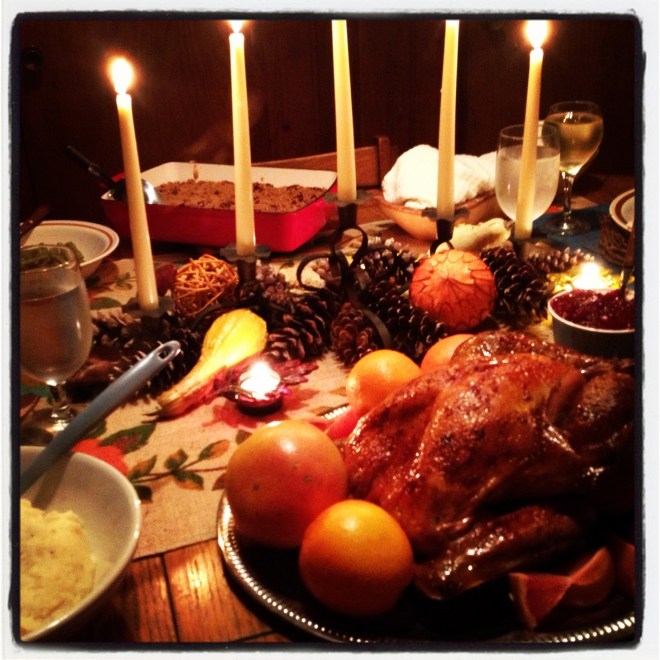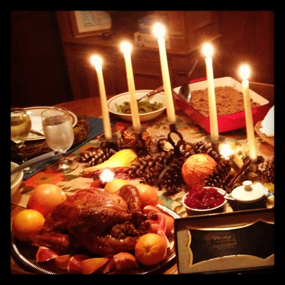 The food all turned out well – I was (and am) so pleased! The turkey ended up being so juicy; when I was carving up the rest after dinner to put it away, there was still juice coming out. The gravy turned out perfectly, and the stuffing – which was from a box – wasn’t bad at all. The sweet potato casserole was delicious as always, and the mashed potatoes and green beans and rolls were as well. The rolls were from Aldi too, but they were still good. Bought cranberry relish in a can too – mmmmmm. Obviously I took some pictures of the tablescape….