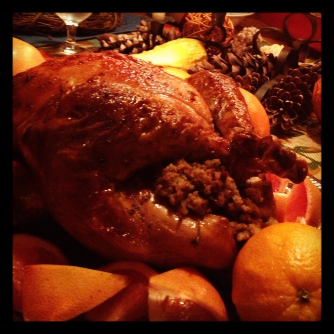 Yesterday ended up being a nice day. We successfully cleaned the house and went grocery shopping on Wednesday evening, and I made the pie as well. Then Thursday morning we lounged around in bed for a while, then went to Waffle House for breakfast, then came back home and started peeling potatoes. Prepped the mashed potatoes and the sweet potato casserole and stuck them in the fridge for later. Started dressing the turkey around 12:30 or so, and had that in the oven by 1:00-ish. This year I followed the roasting and gravy instructions much more closely than I did this summer and things turned out for the better because of that (imagine!). I took the neck and giblets and made a stock with them while the turkey was roasting.