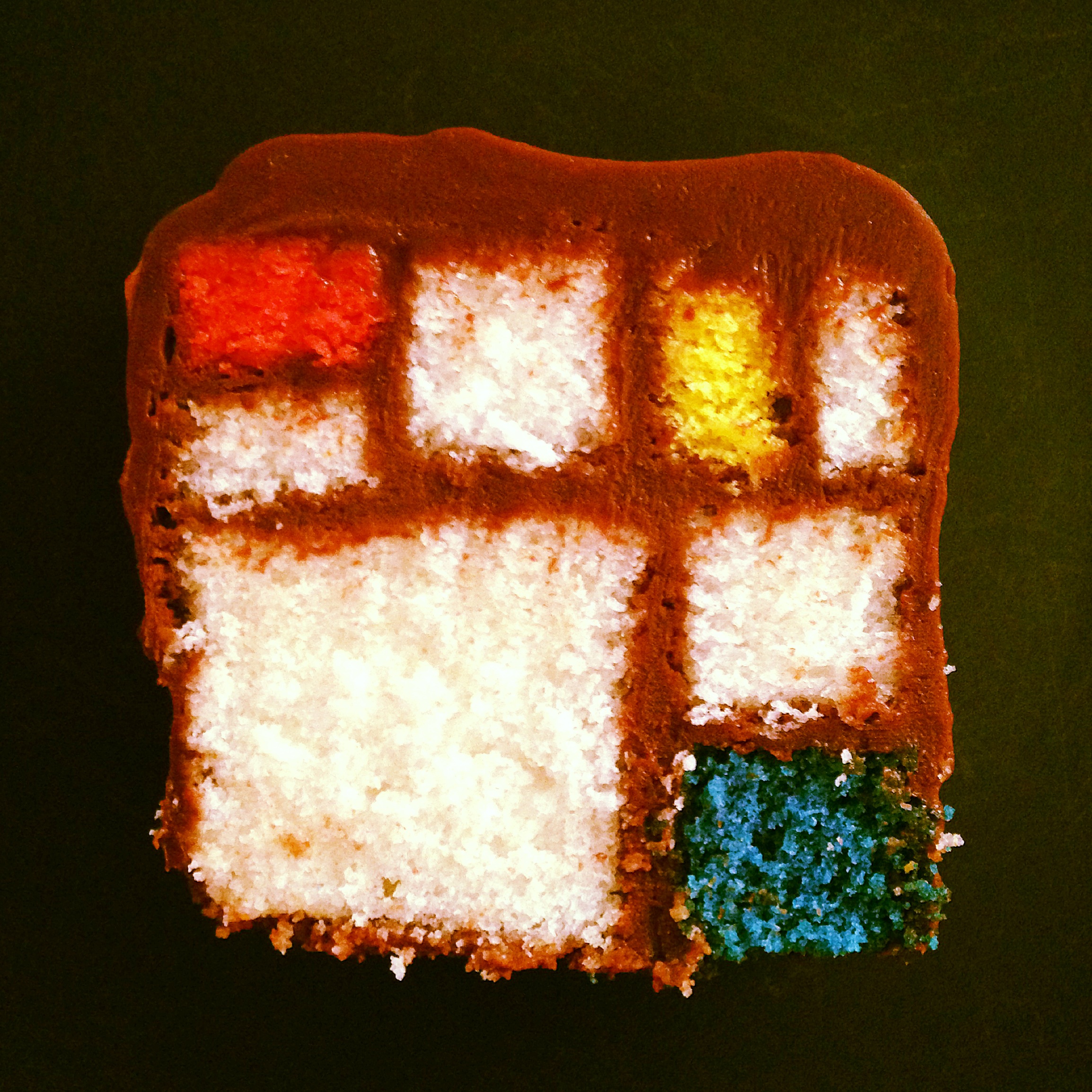 This is a half-recipe, because you’re supposed to bake these in a Pullman pan, which I did not have (and still do not, though I found a $5 one online and ordered it…). But I think it worked out ok. It’s not the straightest cake ever, but it’s still pretty cool-looking! I think I put too much ganache inbetween all the pieces, but this was a practice cake so meant for learning. Which I did!